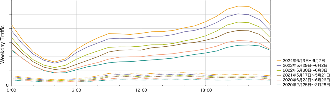 以前のコロナ禍のレポート(注3)(注4)では、感染状況に伴う在宅率の変動に応じて、トラフィック量も大きく変動していたことを報告しました。コロナ禍の最初の緊急事態宣言中には、外出制限でオンラインの活動しかできなくなり、ビデオ会議や動画視聴が急速に広まり、トラフィック量も大きく増えました。当初はインターネットのインフラを圧迫するような事態が危惧されました。しかし、長期的なトラフィック量の推移を見ると、毎年ほぼ均一に増加していて、その増加率も決して大きくはありません。その一方で、平日昼間のリモートワークや学校の長期休暇中の動画視聴と思われるトラフィックが年々増えるなど、生活に変化が起こり定着したことも見えてきます。