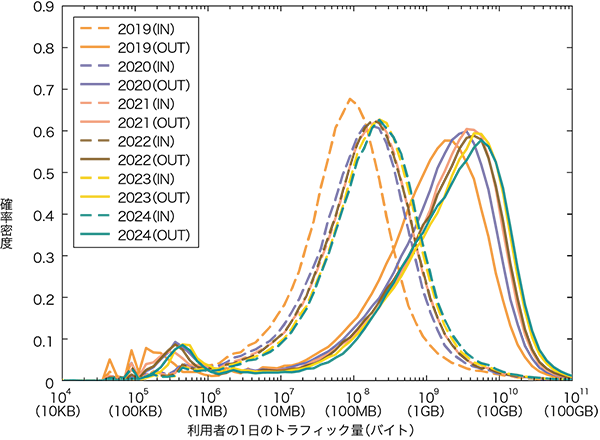図-11は、図-3の利用者ごとの1日のトラフィック量分布の5年間の推移です。本レポートで解析している毎年5月末から6月初めの値です。2019年から2020年が最も増えていて、特にアップロードの増加が大きいことが分かります。しかし、2020年以降は比較的安定した増加になっています。2019年から2024年の5年間で、分布の山の頂点に当たる最頻出値は、OUT(ダウンロード)で2.0GBから5.6GBへと2.8倍に、IN(アップロード)で89MBから224MBへと2.5倍になっています。