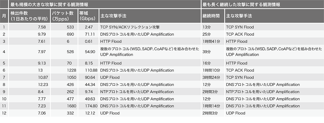 本節ではIIJサービスにて検知されたDDoS攻撃について紹介します。表-3は2024年に検出した攻撃を月ごとに要約したものです。