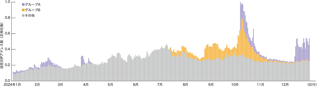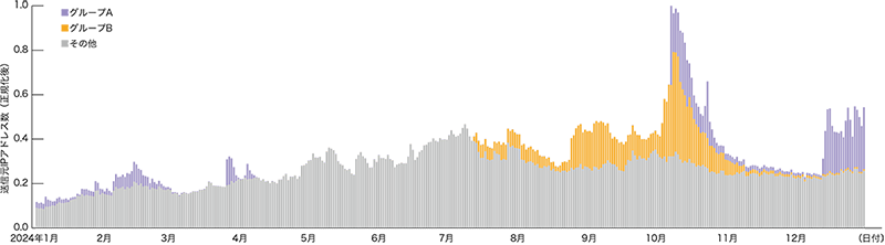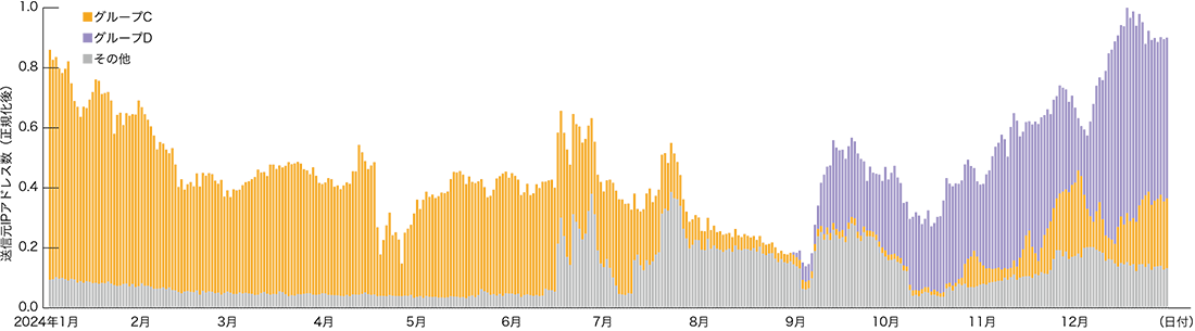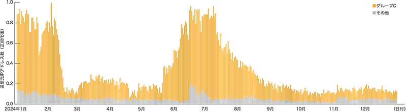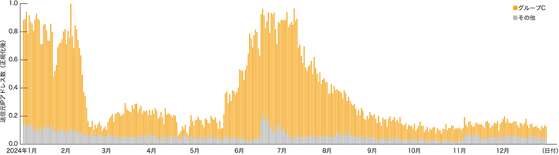 また、「グループC」と分類した攻撃通信は、国内を送信元とするものも観測しています。日本国内を送信元とするMiraiの特徴を持たない送信元IPアドレス数(観測期間の最大値で正規化)の推移を「グループC」とそれ以外に分類して示したものを図-3に示します。