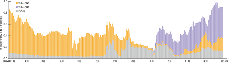 続いて、Miraiの特徴を持たない送信元IPアドレス数(観測期間の最大値で正規化)の推移について攻撃通信の内容に基づいて分類した結果を図-2に示します。調査の結果、1月からは多くの送信元が「/bin/busybox hostname PBOC」のコマンドを含む攻撃通信を行っていました(「グループC」と分類)が、9月にかけて徐々に減少し、その後「/bin/busybox hostname whomp」の実行を含む攻撃通信の送信元(「グループD」と分類)が増加していたことを確認しました。