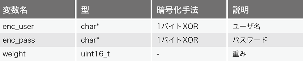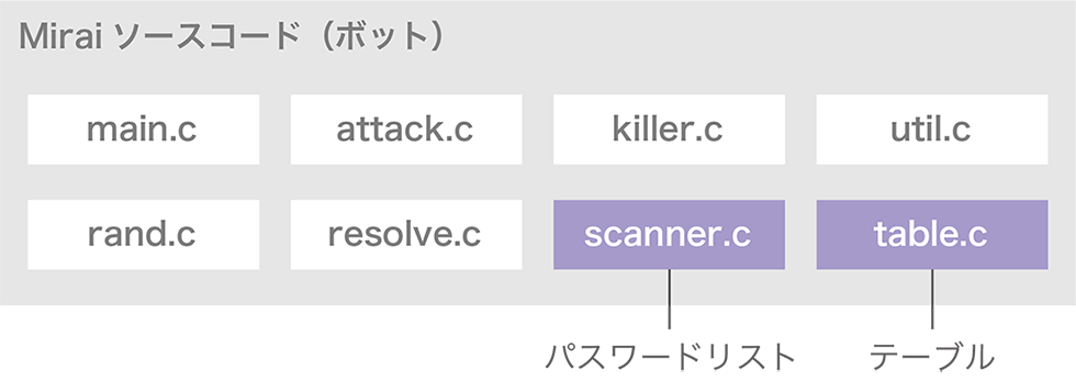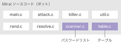多くのマルウェアでは設定情報は暗号化されていることが多く、Miraiの設定情報も暗号化されています。オリジナルのMiraiでは、暗号化されている設定情報はパスワードリストとテーブルの2種類存在します(図-4)。
