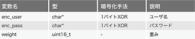 MiraiではTELNETスキャンに用いるパスワードリストがXORで暗号化されて格納されています。パスワードリストを登録する処理はソースコードのscanner.cに記述されており、scanner_init()内でadd_auth_entry()を呼び出してパスワードリストを登録します。add_auth_entry()の引数にはユーザ名・パスワード・重みが渡されます(表-4)。ユーザ名とパスワードは4バイトのXORキーで暗号化されますが、各バイトに対してXORキーを4分割した1バイトで4回XORするので、実質的に1バイトのXORキーでXORされることと同じです。例えば、XORキーが0xDEADBEEFの場合、結果として0x22でXORされることになります(byte ⊕ 0xDE ⊕ 0xAD ⊕ 0xBE ⊕ 0xEF = byte ⊕ 0x22)。重みは、パスワードリストのランダム選択の重み付き確率に用いられる値で、この値は暗号化されません。