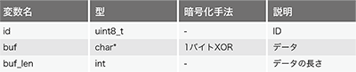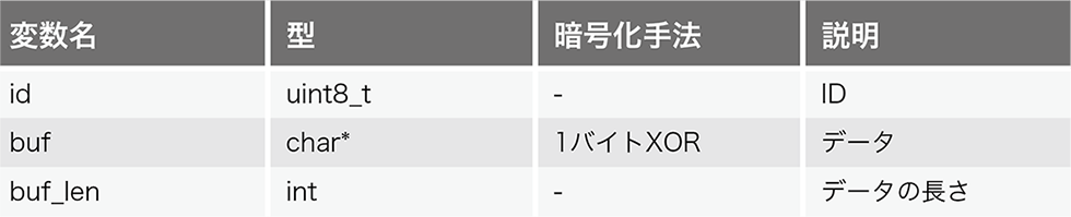 Miraiでは様々な設定情報(以下、テーブル)がXORで暗号化されて格納されています。オリジナルのMiraiのテーブルに含まれる設定情報は、C2サーバのドメインとポート番号・Scan Receiverのドメインとポート番号・標準出力に出力される文字列・敵対マルウェアのプロセスをキルするためのシグネチャ・TELNETスキャンのログイン成功後に実行するコマンド・DoS攻撃に使われるパラメータがあります。テーブルを登録する処理はソースコードのtable.cに記述されており、table_init()内でadd_entry()を呼び出してテーブルを登録します。add_entry()の引数にはID・データ・データの長さが渡されます(表-5)。IDはテーブルの情報を呼び出す際に使用される値です。データは4バイトのXORキーで暗号化されますが、パスワードリストと同じ理由で、実質的に1バイトでXORされることと同じです。ただし、XORキーが定義される箇所が異なるので、XORキーがパスワードリストのものと異なることがあります。