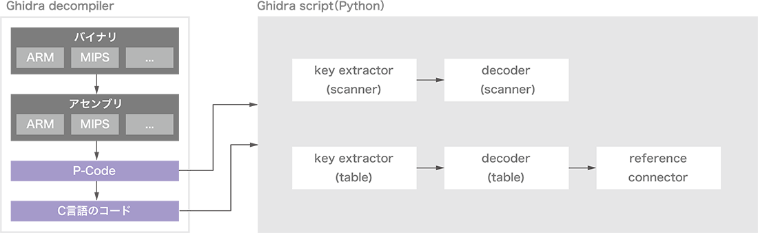 mirai-toushiは、Ghidra(注6)のデコンパイラと中間表現のP-Codeを活用して、PythonのGhidra Scriptで実装しています(図-5)。Ghidraは、アメリカ国家安全保障局(NSA)が公開しているオープンソースのリバースエンジニアリングツールで、JavaやPythonを用いたGhidra Scriptによって解析を自動化できます。Ghidraでは対象バイナリをアセンブリに変換し、アセンブリからP-Codeに変換します。P-Codeの内容をもとにデコンパイルし、C言語のコードを生成します。P-CodeとデコンパイルされたC言語のコードは、アーキテクチャに依存した表現ではないため、これらを活用することでクロスアーキテクチャに対応したツールを開発できます。これによってmirai-toushiでは8種類のアーキテクチャ(ARM・MC68000・MIPS・PowerPC・SPARC・SuperH4・x86・x86_64)に対応しています。以降でパスワードリストとテーブルの抽出についての実装をそれぞれ説明します。