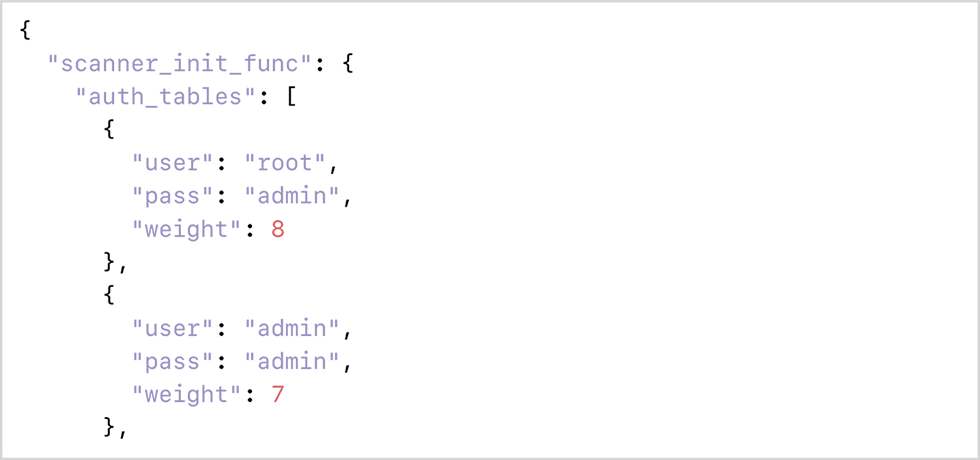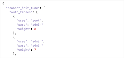 次に、decoder(scanner)で、パスワードリストを復号します。パスワードリストはadd_auth_entry()で登録されるため、デコンパイル結果からadd_auth_entry()が呼び出される箇所を特定します。この際、関数の引数の数や型が正しく解釈されずに、誤ったデコンパイル結果が出力されることがあります。これに対処するため、Ghidra ScriptのupdateFunction()を用いて、関数の引数を正しく定義した上でデコンパイル結果を取得します。第一引数のユーザ名と第二引数のパスワードは特定したXORキーで復号し、第三引数の重みは暗号化されないため、そのまま数値に変換します。抽出したパスワードリストはJSON形式で出力されます(図-6)。