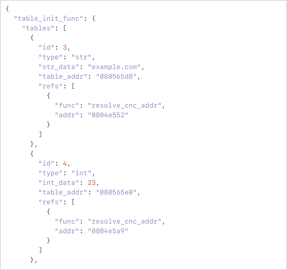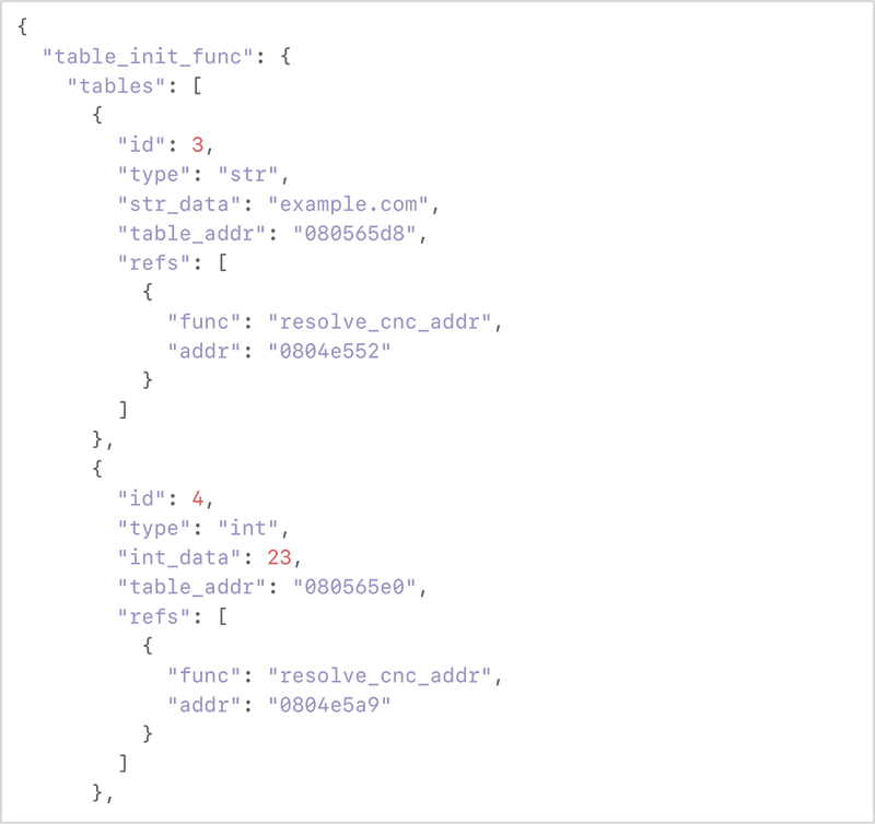 最後に、reference connectorで、テーブルが呼び出される関数とアドレスを特定します。テーブルが呼び出される際は、table_retrieve_val()が呼び出されるため(例:table_retrieve_val(TABLE_CNC_DOMAIN, NULL))、各関数のデコンパイル結果を取得して、この関数が呼び出される箇所を特定します。第一引数にIDの値が入るため、decoder(table)で算出した情報と突合することで、テーブルがどの関数とアドレスで呼び出されるのか特定できます。抽出したテーブルはJSON形式で出力され、refsの値にreference connectorの結果が記載されます(図-7)。