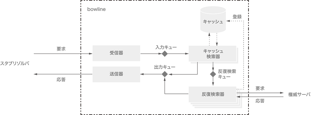 そこで、キャッシュを検索するスレッド(以下、キャッシュ検索器)と反復検索をするスレッド(以下、反復検索器)を別々に用意することにしました。キャッシュ検索器は、キャッシュの検索に失敗した場合、反復検索を反復検索器に任せます。キャッシュ検索器はブロックされませんが、反復検索器はブロックされる可能性があります。キャッシュ検索器と反復検索器は、サーバの起動時に固定数が生成されます。反復検索器の数がキャッシュ検索器の数よりも十分に大きければ、スムーズなパイプライニングが実現できます。