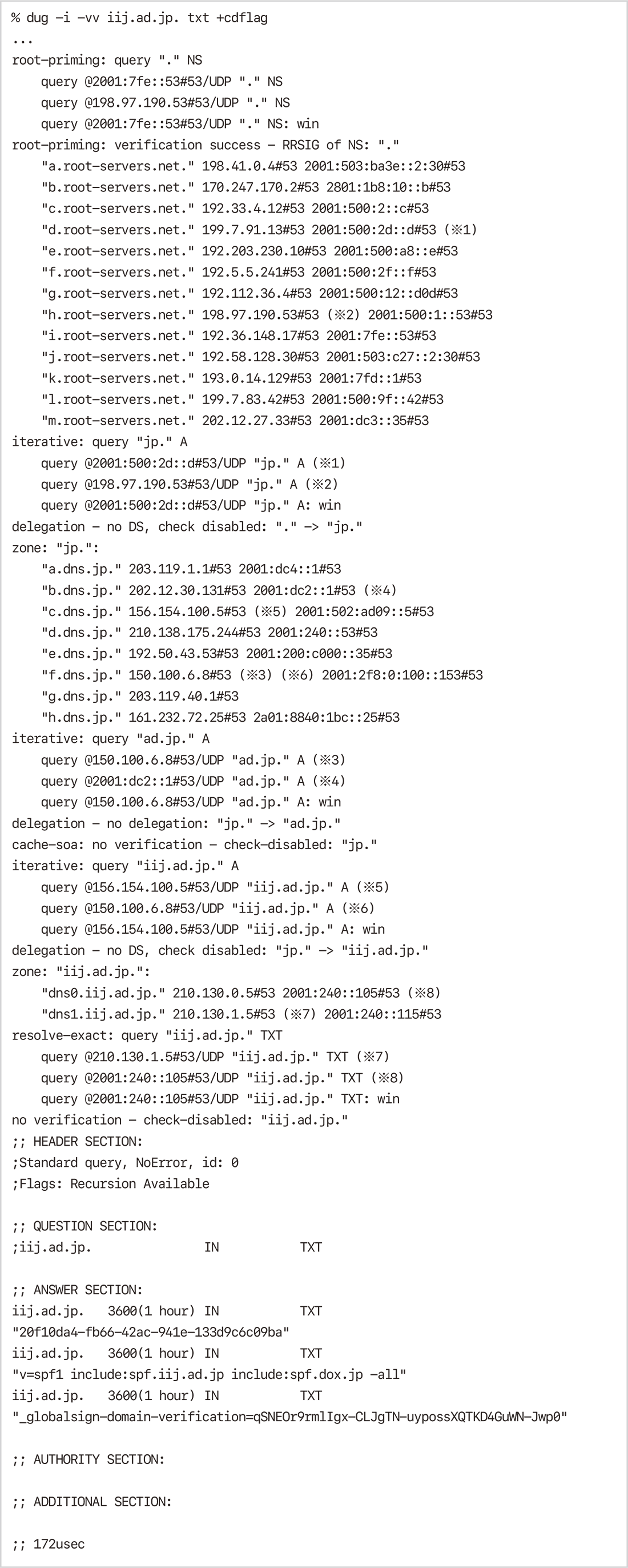 候補の権威サーバのIPアドレスのうち、実際に利用されたものは"(※番号)"を加筆しています。"win"は2つの競争する検索のうち、どちらが勝ったかを表します。委任があればIPアドレスが一覧表示され、そうでなければ"no delegation"と表示されます。