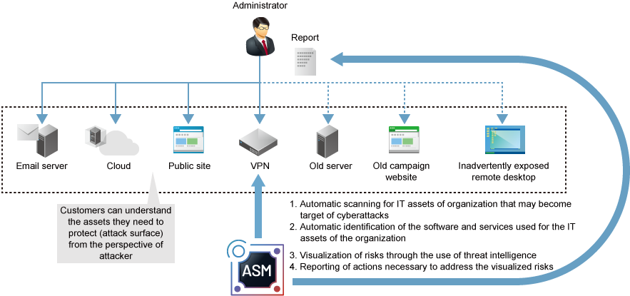 Searches for IT assets via the Internet based on customer domain information and other relevant data. Automatically identifies attack surfaces that may not be fully recognized by the Information Systems Management Department.
