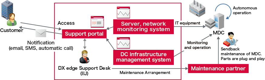 DX edge provides remote monitoring and operation of edge data centers, and sendback maintenance arrangements in case of failure.