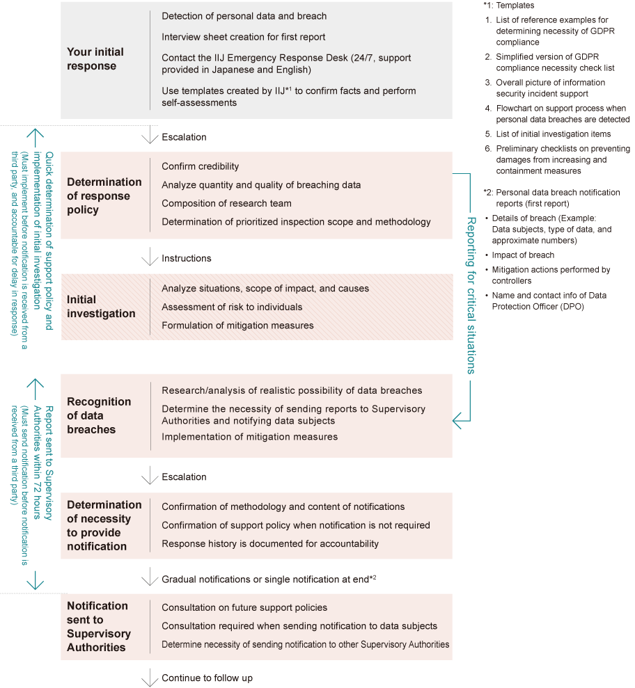 As many companies rarely communicate with Supervisory Authorities and data subjects on a regular basis, IIJ experts will visit the concerned site when an incident occurs and work with the incident response team on-site to provide advice on how to properly submit reports and release information to Supervisory Authorities and data subjects in EU.