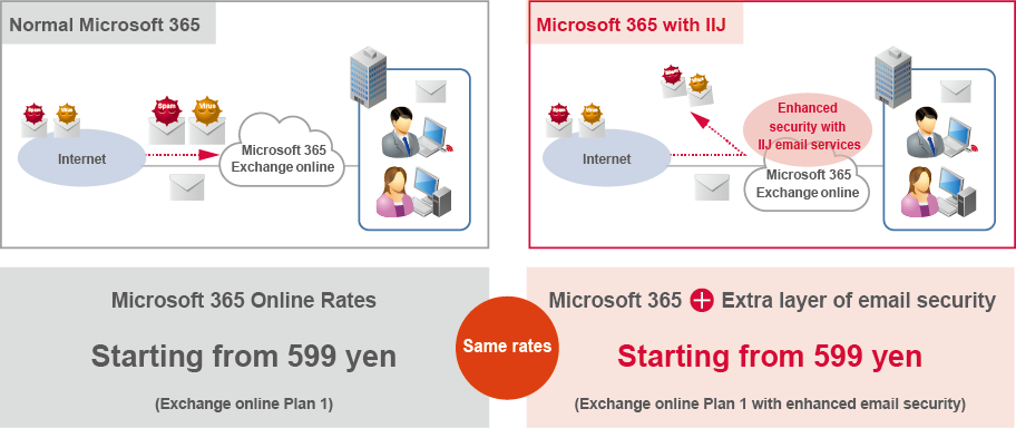 Microsoft 365 with IIJ provides an extra layer of email security with Microsoft 365. With this service, you get Microsoft 365 at the normal price but with stronger security.