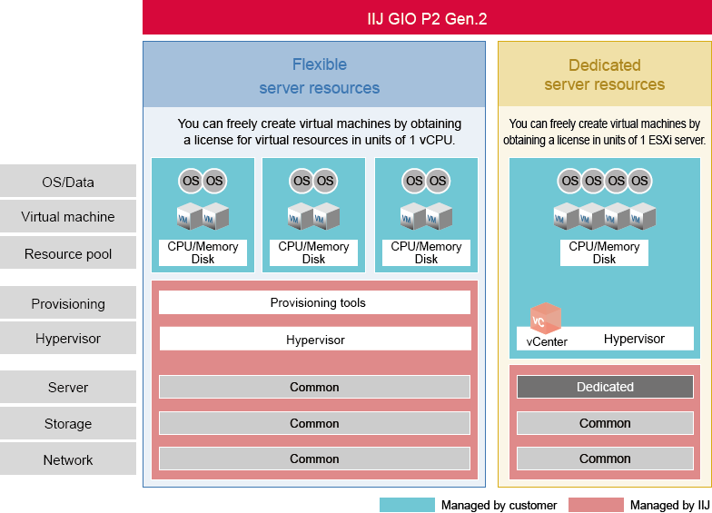 Systems can be configured with flexibility because licenses can be obtained in minimum resource units of "1 vCPU/4 GB memory" from the virtual resource pool, rather than in server units. Moreover, even though it is a hosted private cloud, the hypervisor is managed by IIJ, which can significantly reduce operational loads.