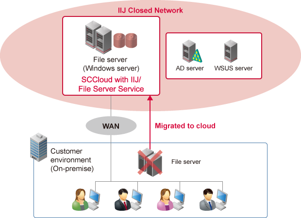 SCCloud with IIJ/File Server Service is a service that provides use of a cloud-based file server. Since the file server is a Windows server, the same functions as an on-premise server can be used. AD servers and WSUS servers are also migrated to the cloud for easy linkage.