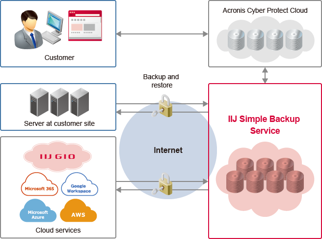 The IIJ Simple Backup Service is a low-cost cloud-based backup service that uses the Acronis backup engine. This service is used to back up and restore system images and data on physical and virtual servers in the IIJ GIO cloud service and on-premise environments. Data on Microsoft 365 and Google Workspace can also be backed up to cloud storage.