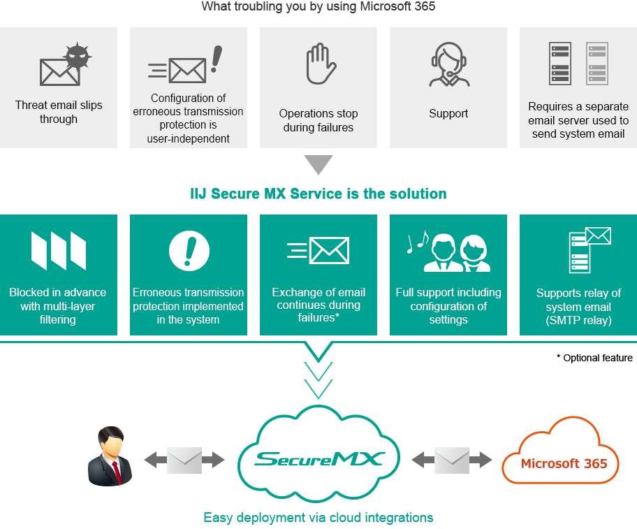 By using Microsoft 365 together with the IIJ Secure MX Service, protection feature against information leaks and erroneous transmissions will be remarkably enhanced. This multi-layer protection measure will enhance security against various external threats.