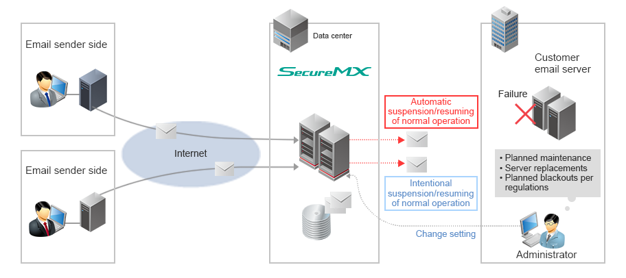 If a failure occurs in one of your servers or the network, IIJ will temporarily hold your email. Because email is held/delivered by IIJ, email is returned to the sender MTA so that there is no delay in retransmission. Administrators have the ability to switch between holding and normal operation from the customer's exclusive management page. This enables you to control delivery during planned outages, such as building blackouts and maintenance.