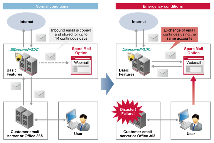The Spare Mail Option provides access to Webmail over a browser in the event that customer email systems are unavailable for extended periods of time due to disaster, failures, maintenance, or other circumstances. Email can be continuously exchanged on the same domains and accounts.