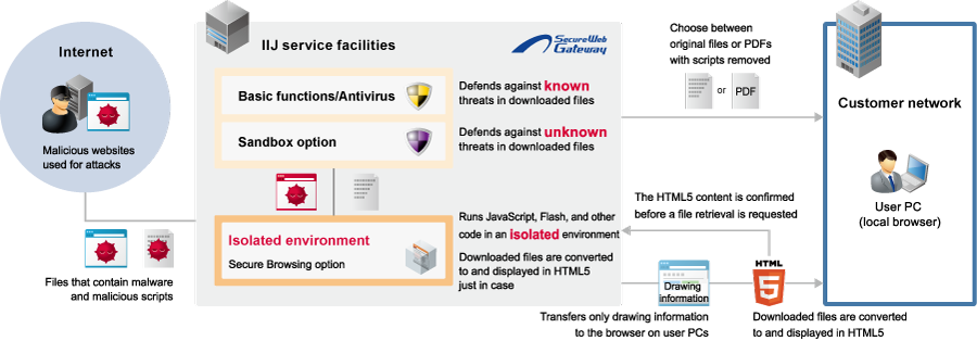 This service provides security measures over both incoming access, by preventing virus infections and access to risky sites, and outgoing access, by detecting and blocking communication from PCs infected with malware to malicious websites.