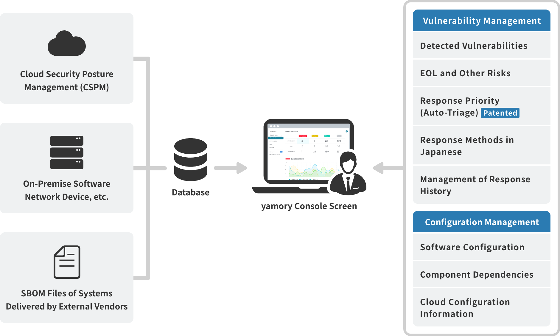 Additionally, with configuration management, risks such as expired software licenses and cloud configuration deficits can be managed using our proprietary database.