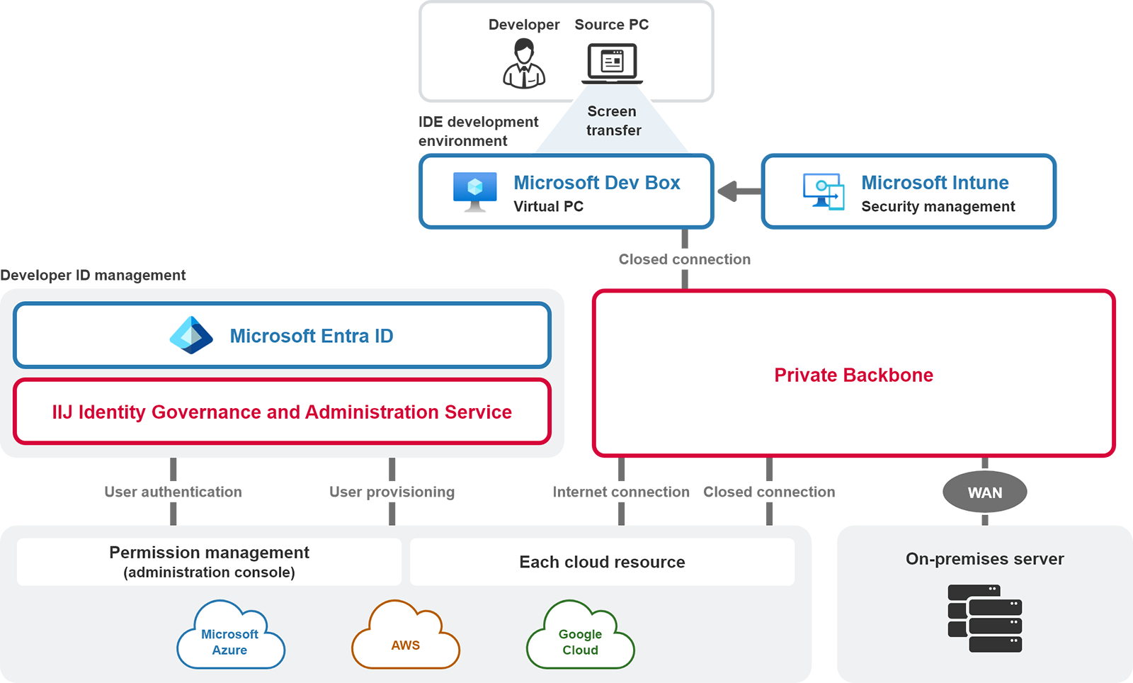 IIJ ZeroTrust Access Solution for Developers is a solution that combines VDI (Virtual Desktop Infrastructure), ID management, and networking to enable multi-cloud development environments. By enabling rapid provisioning of development environments and centralized management of developer IDs, it achieves both improved productivity and robust governance.