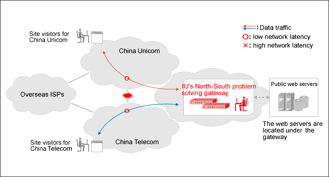 The Internet infrastructure for this service is provided by China's two largest telecommunications carriers, China Telecom, and China Unicom, both headquartered in Beijing, providing low-latency communications. In the past, communications that straddle the networks of both these carriers experienced latency and interruptions (the North-South problem in telecommunications). With this service, IIJ is able to automatically find the fastest connection for the customer. This is the first cloud service in the world to provide this method of connectivity.