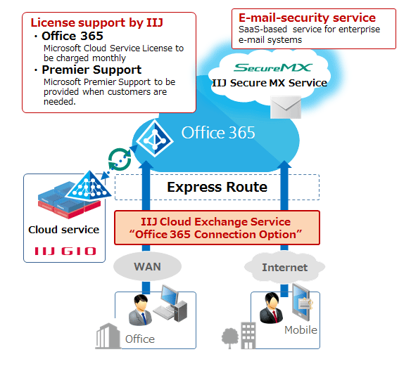 "IIJ Cloud Exchange Service for Microsoft Azure" enables customers to access the Microsoft Azure private network connection service "ExpressRoute" via dedicated private networks built for each customer on IIJ's backbone network. By using the "Office 365 Connection Option," customers can access Office 365 services via an ExpressRoute connection-without connecting via the Internet-providing a more secure, lower latency, and stable transmissions environment for the use of business applications.