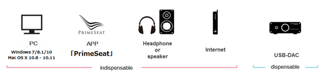 Content can be listened to by installing the dedicated software PrimeSeat on a PC (Windows or Mac). Depending on the audio format of the content, a compatible converter (DAC)(*) or stereo device may be required.