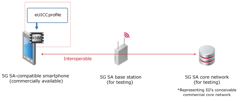 IIJ's trial to download the GSMA(*2) certifiled eSIM-which installs eUICC (*3) profile with 5G SA compliance, as standardized by 3GPP, (*4) -to commercially available 5G SA-compliant smartphones confirmed to work well in operational testing environment of 5G SA base stations and a 5G SA core network. IIJ is the first operator in Japan to complete the development and testing of a 5G SA-compatible eSIM (based on IIJ's findings).