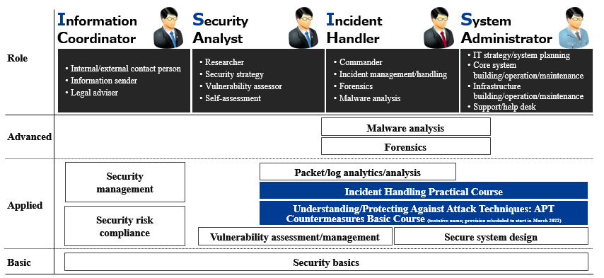 Based on knowledge accumulated over more than 20 years of conducting security service operations and dealing with incidents at SOC as well as the educational track record of nurturing security analysts in-house, IIJ offers a program that systematically enables learning knowledge that is actually needed on-site by classifying it into the levels of "basic," "applied" and "advanced." From the basic level wherein one can learn basic knowledge to the highly practical applied and advanced levels for specific fields, attendees can efficiently acquire knowledge and skills according to their required level.