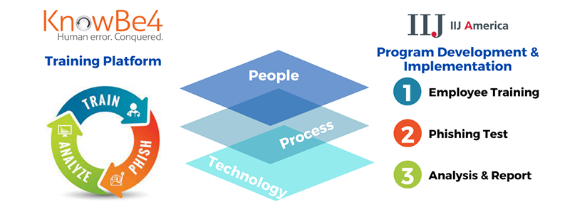 In order for a company to make its security measures effective, it is essential that training programs are continuously implemented to raise the security awareness of each employee. The IIJA Managed Cybersecurity Awareness Training Program utilizes KnowBe4, the provider of the world's largest security awareness training and simulated phishing platform (headquarters: Florida), and covers everything from designing of training programs and implementation/operation of simulated phishing tests to analysis of the results, which will be carried out by IIJ America's expert engineers as a managed service. The training program will be offered as a monthly service based on one of the three levels of frequency of implementation.