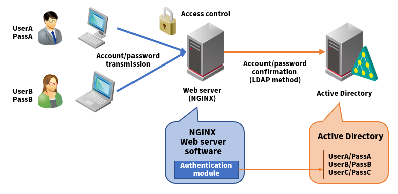 When NGINX is used on a website that requires access restrictions, such as an in-house portal site, an authentication module must be added to check users and determine whether they can access the site or not. The ngx_auth_mod developed by IIJ is a function that links the authentication function of NGINX with in-house Windows accounts (Active Directory) using the LDAP (*2) method. By using ngx_auth_mod, accounts and passwords normally used for Windows can be directly used for web access control, making it possible to achieve both security and convenience. LDAP authentication modules for NGINX have been provided by other developers, but ngx_auth_mod is designed to be more security-conscious than other modules and is also easier to configure.