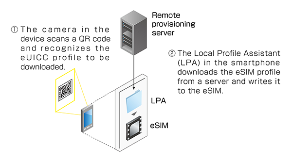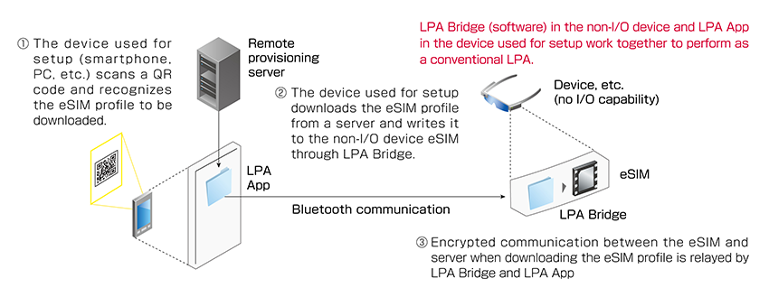 LPA stands for Local Profile Assistant, the functionality for downloading and writing the eSIM profile to an eSIM, as standardized by GSMA for the consumer model. The essence of LPA Bridge is to enable use of this consumer model methodology with non-I/O devices. The technology consists of two parts, LPA App with the interactive functionality for operations such as entering an activation code, and LPA Bridge with the functionality for relaying communications between the eSIM on non-I/O device and remote provisioning server. LPA Bridge is set up on the IoT, wearable, or other non-I/O device, while LPA App is installed in a user device (smartphone, PC, etc.) for setting up the non-I/O device.