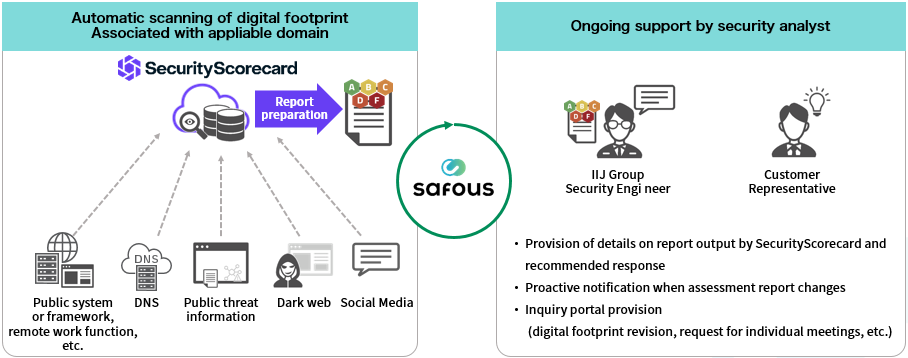Based on a risk assessment platform that uses attack surface(*) monitoring and threat information provided by cybersecurity company SecurityScorecard, the service identifies attack surfaces from the same standpoint as attackers, scores the security risks, and issues reports, while also providing threat analysis by IIJ Group security engineers and proposing improved countermeasures. IIJ has now enhanced the services in the annual contract plan and made the plan available at a reduced price, enabling customers to implement periodical security risk assessment even more readily than up to now, for quick response to the threats occurring daily.