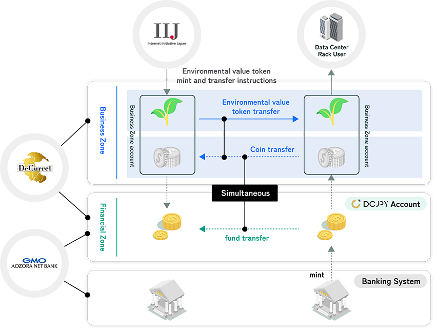 DeCurret DCP Inc. ( Representative Director: Satoshi Murabayashi, hereinafter "DeCurret DCP"), GMO Aozora Net Bank, Ltd. ( Chairman and Representative Director: Takehito Kaneko / President and Representative Director: Takeshi Yamane; hereinafter "GMO Aozora Net Bank"), and Internet Initiative Japan Inc. ( President and Co-CEO&COO: Eijiro Katsu; hereinafter "IIJ") announced that IIJ has started digital assetization of environmental values(*1) and settlement transactions in the digital currency DCJPY(*2)minted by GMO Aozora Net Bank in the DCJPY Network, a system released by DeCurret DCP for production verification this July.
