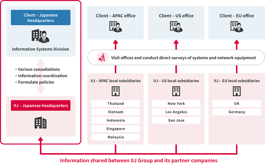Engineers from IIJ, the IIJ Group, or its overseas subsidiaries visit the client’s local sites, and conduct on-site surveys to understand the circumstances. This makes it possible to understand the circumstances of the IT environment in areas where it had been difficult for the client to do so independently.
