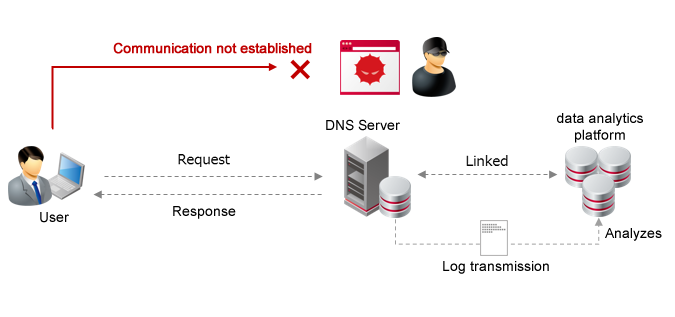 In 2016, IIJ built information analysis infrastructure based on big data security analysis and started implementing independent countermeasures to restrict malicious communication such as malware infection. After obtaining the consent of customers, the logs of subscribing customers are analyzed from a wide range of perspectives and reputation data (*2) is generated to enable malicious communication to be blocked. This malware countermeasure initiative is based on DNS filtering. When the DNS server you are using in an access service sends a name resolution request to a C&C server, malicious communication is blocked if the destination matches the reputation data. In this initiative, the logs for your DNS and related communication will also be used for customer support, and statistics and disclosing reports, as well as analysis to generate and improve the quality of reputation data.