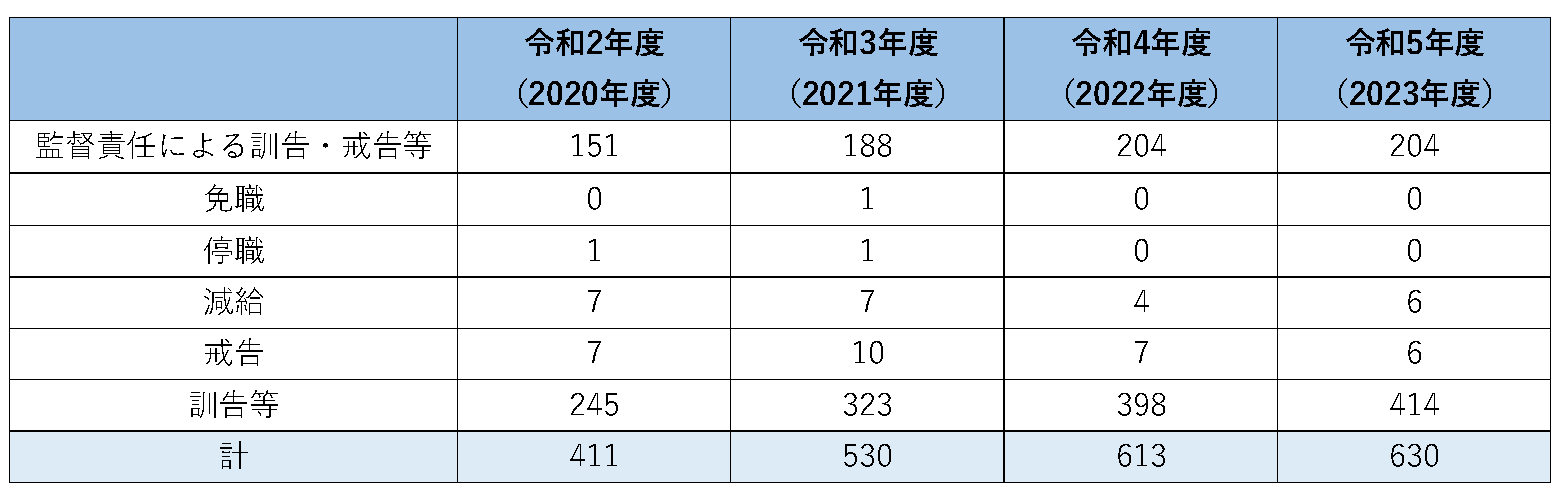 学校でのセキュリティインシデントが増えていることを反映してか、この調査では令和2年度(2020年度)より「個人情報の不適切な取り扱いに係る処分について」という項目が新設されています。そして「免職」「停職」「減給」「戒告」「訓告等」の処分となった教員数とともに、「監督責任による訓告・戒告等」の実数も分かります。