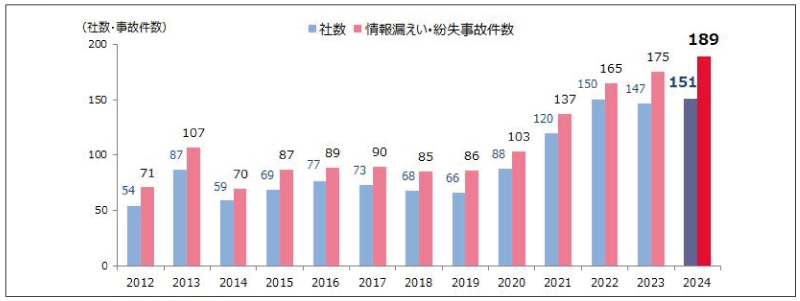 出典: 東京商工リサーチ「2024年上場企業の「個人情報漏えい・紛失」事故 過去最多の189件、漏えい情報は1,586万人分」