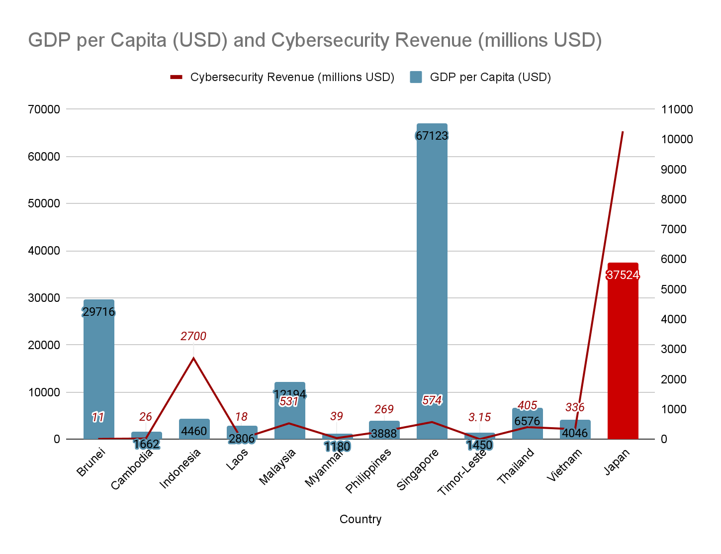 東南アジア各国の状況を包括的に把握するために、日本を参考にしつつ東南アジアの一人当たりGDPとサイバーセキュリティの推定収益の両方を見てみましょう。