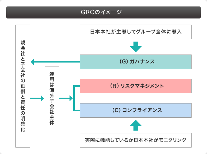 こうした難問を前にして、駐在員個人の頑張りだけで海外子会社マネジメントを実現しようとすることには限界があります。1つの有効な解決策としては、グローバル企業グループ総本山としての日本本社が全体を主導しつつ、グループ全体に理解され受け入れられるマネジメントの仕組みを、現地法人と協力しながら組織的に導入することです。仕組みの実際の運用は海外子会社に主体的にやってもらい、その運用が実際に意図したとおりに機能しているかを、本社が「ガバナンス(G)」「リスクマネジメント(R)」「コンプライアンス(C)」の切り口でモニタリングすることが求められるのです。
