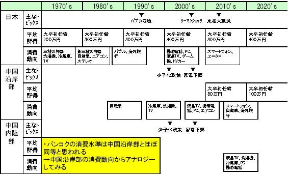 これらの検討にあたっては、これまでの先進国で起こってきた過去からのトレンド分析は大いに役立つはずです。図1は日本が1970年代の所得向上に伴い、どのような商品の購入が喚起されてきたかと中国の沿岸部・内陸部の所得の変化を比較したものです。あるGDPや所得を超えると、急に生活水準が向上し、消費が喚起されるともいわれています。