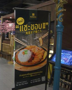 サイアム・パラゴン、エンポリアム、ターミナル21といった大型ショッピングモールに入ると、日本の外食チェーンが並び、ここは日本ではないかと錯覚します。大戸屋、吉野屋、8番ラーメン、モスバーガー、CoCo壱番屋、ペッパーランチなど。それぞれの店にタイ人の若いカップルが並び、通常はフォークとスプーンを用いる慣習を持つタイの人々が、上手に箸を操り、おいしいそうにお皿をつついています。お店の看板、雰囲気は日本のお店そのものです。看板は日本語で書かれているので我々日本人にとってはなじみやすく、タイでも平然と風景の中に溶け込んでいます。店員は“いらっしゃいませ!”と大きな声で客引きをしています。店内に入っても日本風のサービスは続きます。席に着くと再び、“いらっしゃいませ、ご注文は?”。本当にここはタイなのかと錯覚します。メニューはタイ語、日本語、英語が併記されています。日系のお店では日本風のサービスをすることがブランドなのでしょうか。メニューは日本と全く同じ店もある反面、現地メニューが多い店もあります。吉野屋は日本で見たことのないメニューが多く、例えば、鳥天ぷら丼がそうです。日本ほど牛丼を主力製品として売り込んでいないような気がします。どの店も、飲料水は別料金、会計はテーブルの場合とレジの場合があります。テーブルのお店では多少のチップを払うというシステムは日本と異なるところです。