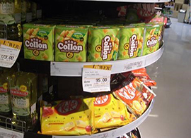 菓子類、ラーメン、生鮮食品(野菜、豆腐、練り物)等、様々な日本の商品がスーパーの棚に並んでいますが、値段はもちろんローカルメーカーの商品に比べ、高めです。日本での価格のほぼ倍であるため、現地の通貨水準からすると6倍程度の価値になると思われますが、これだけの商品が並んでいるのですから、それなりに売れているはずです。タイの中間層が購入していると思われます。