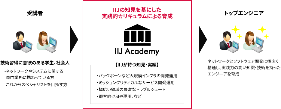 一方、コンピュータサイエンスを基盤とするネットワークを支えるエンジニアの枯渇は、技術革新が進展するにしたがって、極めて深刻な事態となっています。2000人を超えるネットワークエンジニアを育てたIIJは、世界でも極めて、稀な存在です。今回、公にする「IIJアカデミー」は、IIJのエンジニアを講師として、まさにいま必要とされている高度な運用技術をもつネットワークエンジニアを短期間で育成する機関をつくろうという試みであり、新たなカリキュラムをつくり、ネットワーク社会を支える技術者の育成という、社会の要請に応えようとする取り組みです。