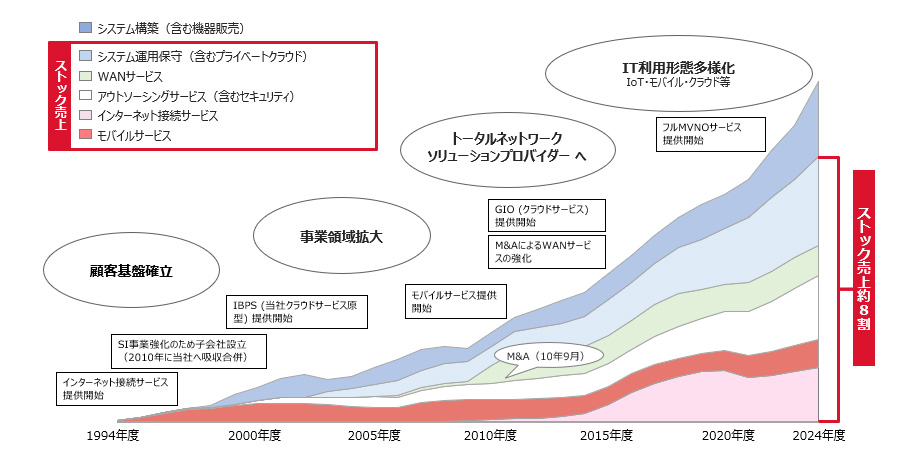 創業期より提供してきたインターネット接続サービスにおいては、個人向けを含む多くの新規ISP事業者の市場参入により価格競争が激化し、2000年頃より提供価格が急速に低下いたしました。