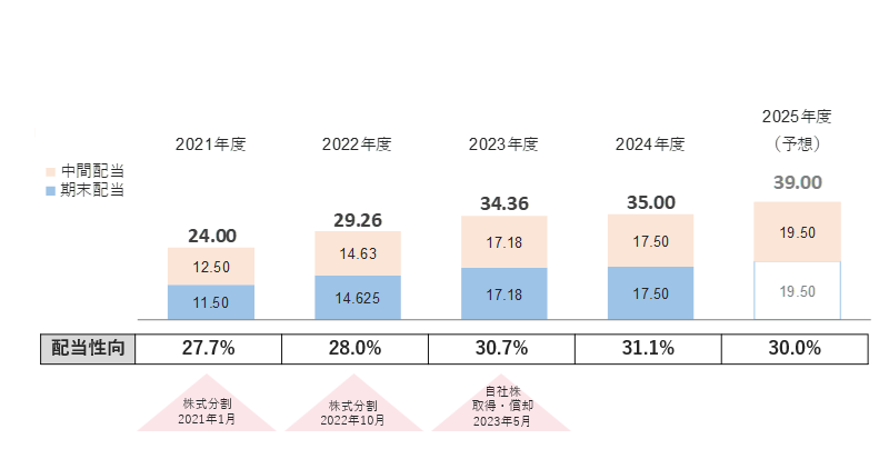 DX(デジタルトランスフォーメーション)の必要性が提唱されているように、法人ITマーケットの需要は益々拡大すると想定しております。そのような成長市場において、当社グループの事業は成長途中であり、今後も売上高伸長と営業利益率を向上しながら事業規模を拡大することで、継続的な企業価値向上を実現していきたいと考えております。当社は株主還元として実質30%程度の配当性向を継続しており、一株当たり配当金は、ここ数年、利益成長に伴い大きく増加しております。今後も他社に先駆けた事業投資や成長を加速させるM&A機会への機動的な対応等のための一定の内部留保と財務体質の強化にも配慮しながら、利益向上に伴う株主還元増加を進めてまいりたいと考えております。