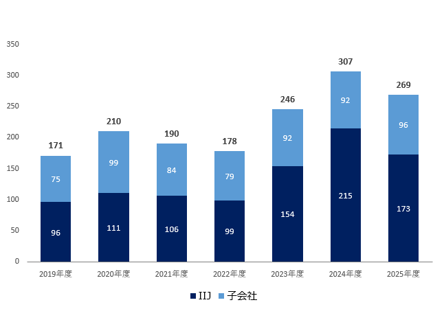 当社グループの人材戦略は、新卒採用の継続及び育成を主軸に、即戦力を中途採用で賄うとの基本方針であり、これを継続しております。当社は国内初の本格的インターネットサービスプロバイダーであり、インターネット関連技術を追求したい学生・技術者による認知度は高く、近年の厳しいIT人材の採用環境においても、単体及び連結の新卒採用数は増加しております。単体の新卒採用における技術者の割合は約7割であり、その母数のうち博士・修士の割合は約4割です。新卒採用の施策として、技術系部署(ネットワーク・クラウド・セキュリティ・IoT等)での実践的なインターンシップ機会提供により、技術者を志望する意欲的な学生と早期に接点を持ち、これら学生が当社での業務を通じた成長機会を認知してもらう取り組み等も推進しております。更なる事業成長には人材の継続拡充が必要との認識であり、2025年度の新卒入社規模は単体173名、連結269名でした。今後も人材獲得に注力してまいります。