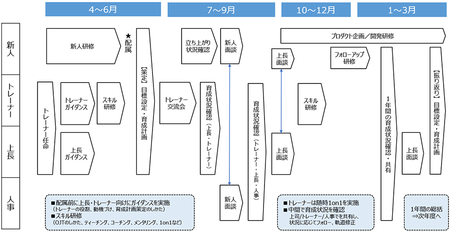 人材育成は業務を通じたOJT(On-the-Job Training)を根幹とし、従業員の年次や役割に応じた階層別研修、専門知識やスキル習得を目的とした部門別研修等にて補完しています。当社グループは、国内最大規模のインターネットバックボーン構築・運用、斬新なサービスの自社開発・運用等の業務機会を提供することが、意欲的な技術者層のモチベーション向上に繋がるものと考えております。営業職はネットワーク・システム等の知識が必要となりますが、技術基礎研修、IIJサービス理解研修やサービス理解テスト等により、これら知識の習得・定着を図っており、営業活動を通じたOJTを補完しております。営業部門主催によるトップパフォーマーの営業アプローチ・成功提案事例等を共有する勉強会等もあり、多くの文系出身者の営業が活躍しております。当社の新卒従業員はこれら業務における上司からの指導に加え、OJTトレーナー研修を受講した上司以外の従業員と個々の特性・志向を勘案した能力開発目標を設定し、一年を通して早期に自律的な業務遂行ができるためのサポートを受けます。2018年度以降、毎年100名を超える従業員がOJTトレーナー研修を新たに受講し、トレーナー経験者は年々増加しております。これら人材の増加は全社的なOJTレベルの向上に繋がるものと考えております。